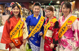山形県主催の「ハワイつや姫10周年記念イベント」で行われたパーテイーのときのハワイ花笠ガールズで、写真のメンバー4人は「つや姫大使」も務める(2024年5月ハワイ・ワイキキショッピングプラザ)